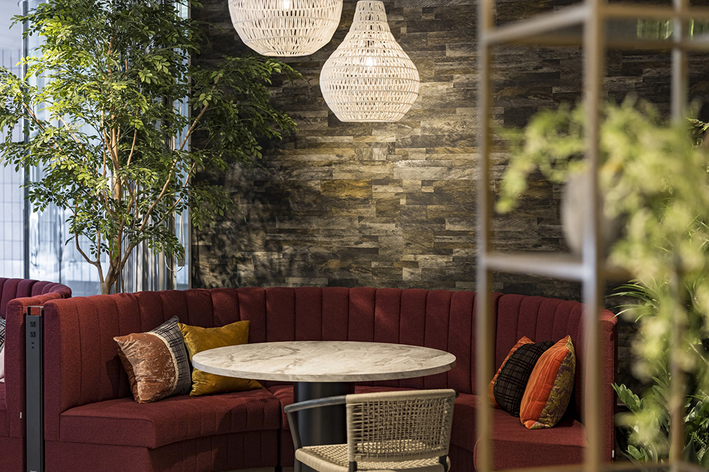 ホテルロビーをイメージした空間にするため、システム天井を全て在来天井に作り直し、下がり天井を設けて間接照明を設置することで、照度を担保できる設計としています。