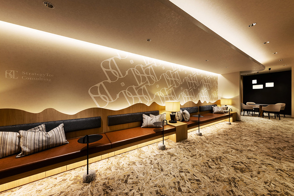 移転プロジェクトに合わせて刷新されたロゴは、「より周知されるように」という想いを込めてパターン化したグラフィックを壁面に描き、それをより演出できるよう、折上げ天井を設けて間接照明を設置しています。