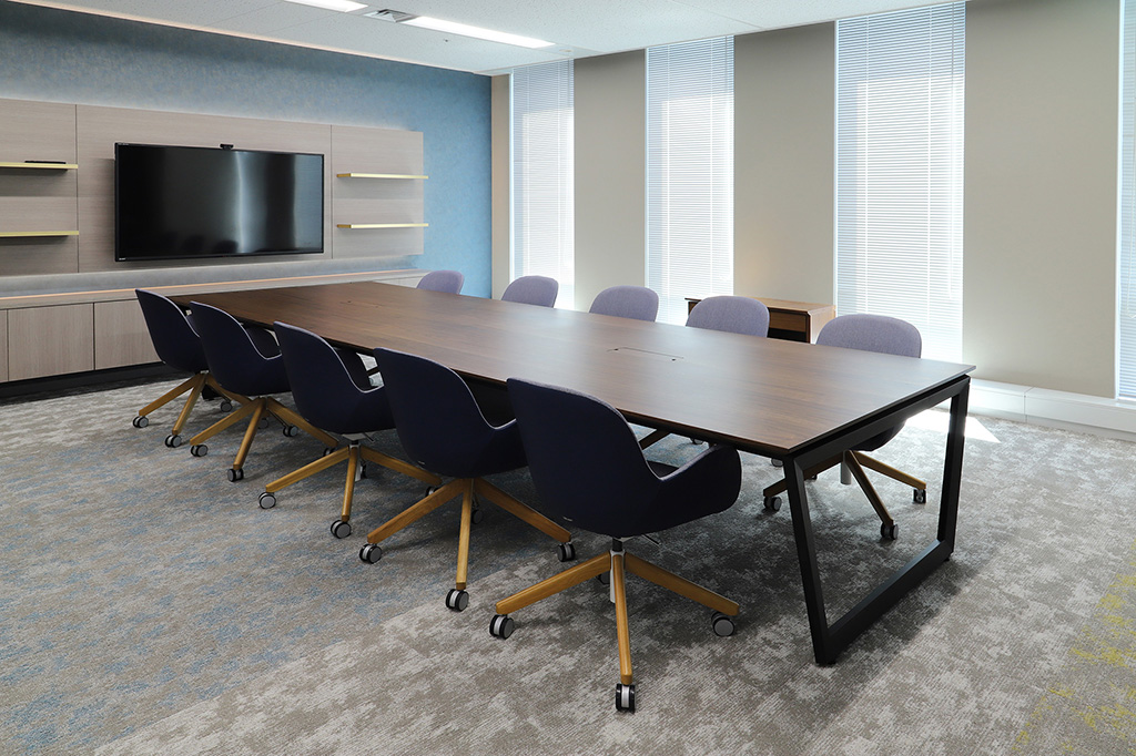 執務スペース以外のオープンスペースに、ミーティングスペースを設ける場合は、多目的な休憩スペースとしても使えるようにするために、長尺の床材・塩ビの床材を選ぶことが多いです。