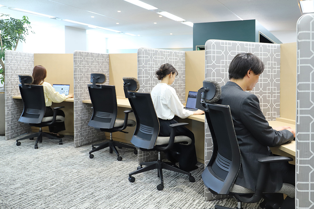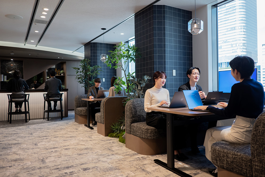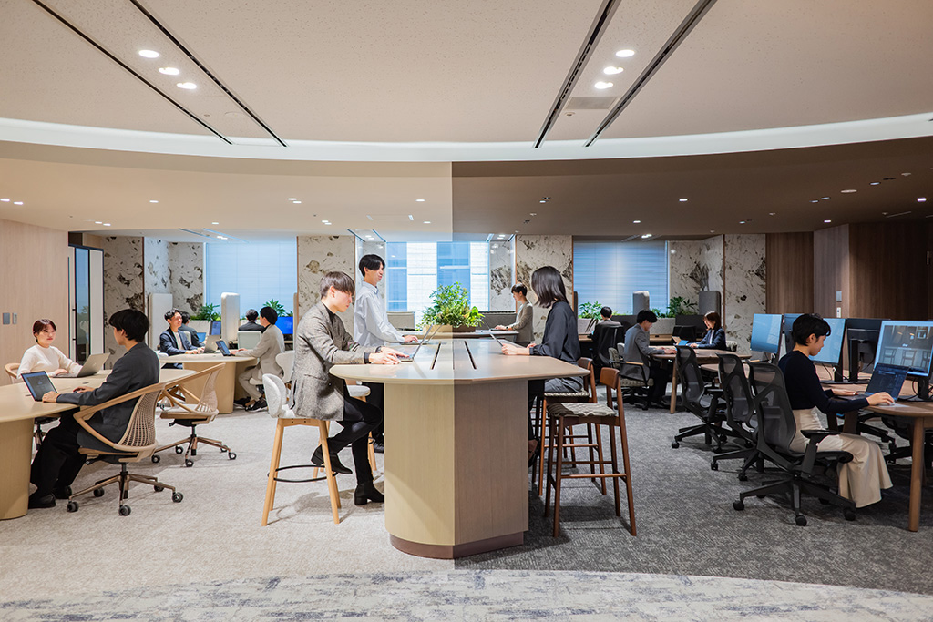 さわやかな気分で自分らしく過ごせる執務空間や、ミーティング、休憩、集中して業務できるカウンター席など、さまざまな座席を設け、気分を切り替えて自由に過ごせる空間です。