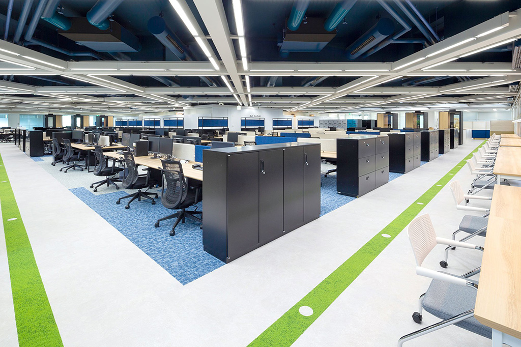 全体をビル標準から変更するのではなく、床材を部分的に張り替えることで、通路であることを示したり、エリアを分けたり、ここに物を置いてはいけない、といったことを視覚的に伝えることも方法です。