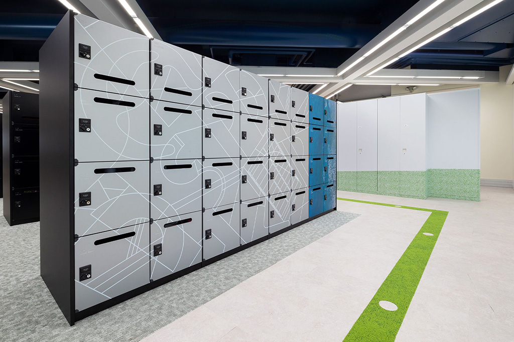 ロッカー表面の下部に貼られた芝生のようなグラフィックシートや、緑色の床材など、「ゴルフ」を連想するようなデザインを所々に取り入れ、遊び心のあるオフィスとなっています。