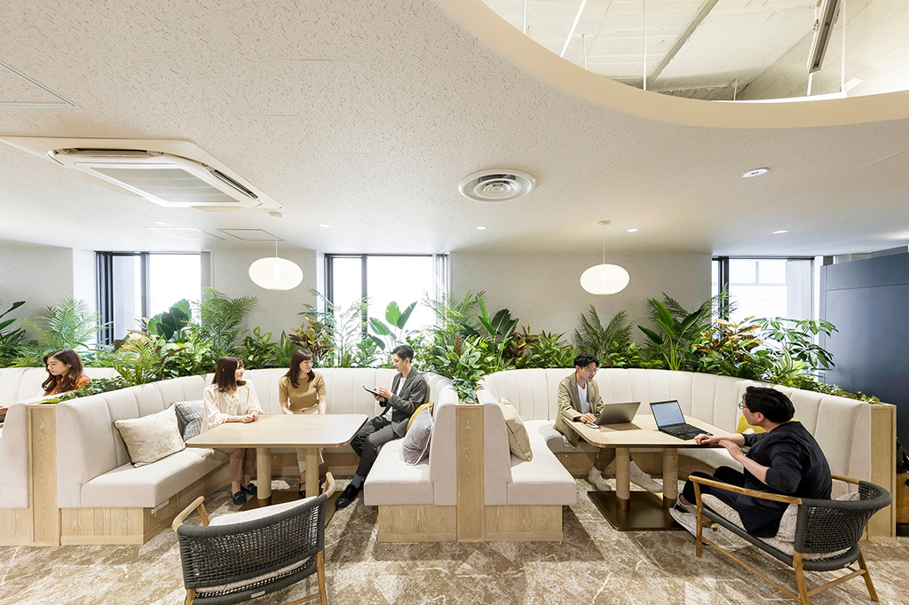 ファミレス席をメイン導線にあえて設置することで、社員同士の接点が増えて、コミュニケーションの向上促進ができました。