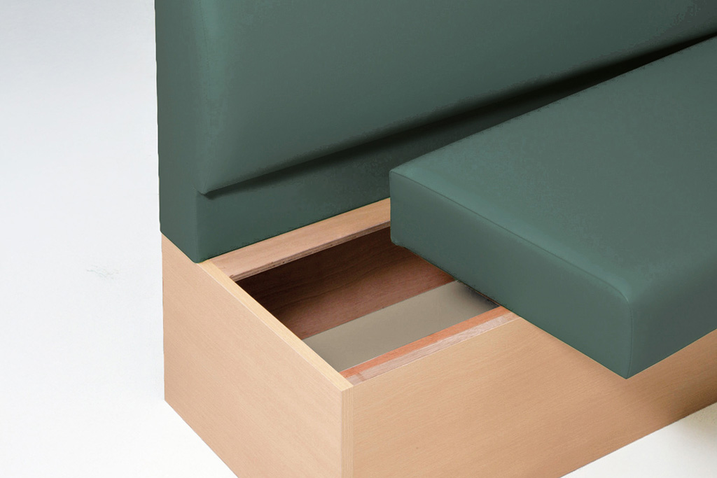 ファミレス席のソファ下スペースを有効活用するには、座面の下に収納を作ることがオススメです(座面を開けると、収納スペースが現れる)。