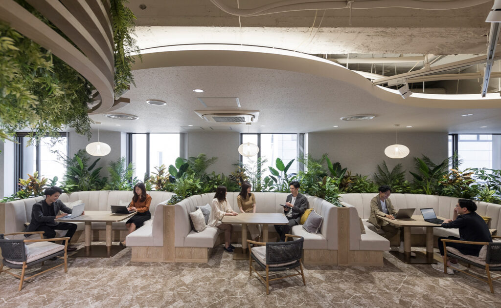 テーブル席の場合、一人当たりのスペースを執務デスクより広めに確保したり、ソファ席を設けてくつろげる空間を演出したりします。多様な過ごし方ができるよう、家具の配置に変化を持たせるのも効果的です。