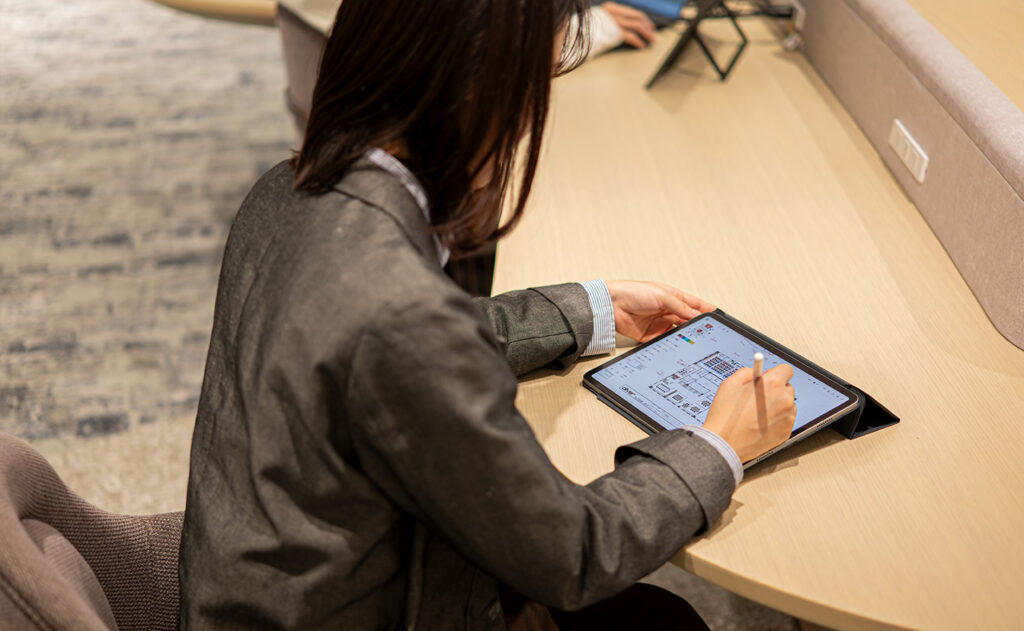 オフィスのレイアウト図面が固まったら、その図面をもとに、どこに、どのくらいの数のコンセントが必要かを具体的に落とし込んでいきます。