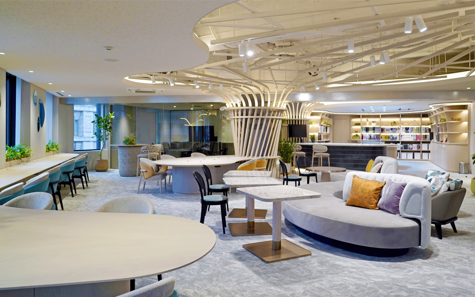 個人やチームの成長を支えるプロダクトを採用。ティーチングやコーチングに最適な距離感のデスク配置や、透過性・可変性・可動性をテーマにした空間設計によって、一人ひとりの働き方に寄り添う「行動的共鳴」を促します。