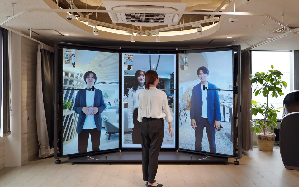 等身大映像によって4拠点間を常時つなぎ、“同じ空間にいるような”自然な対話を実現します。さらに、リアルサイズシミュレーションとしても活用可能です。