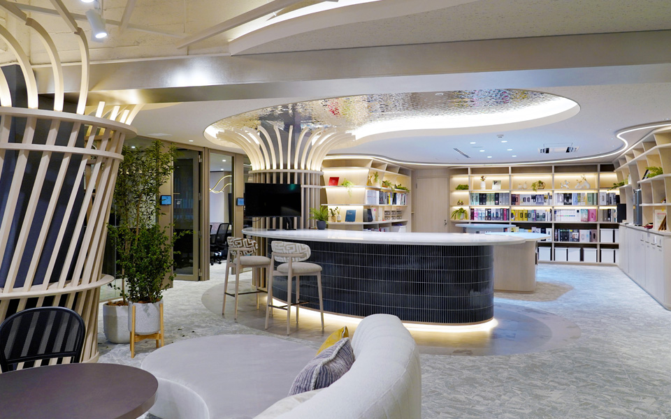 素材やプロダクトを常設し、社内外との共創を生み出す場。日本橋川からインスパイアされた有機的な形状とテクスチャーが印象的です。