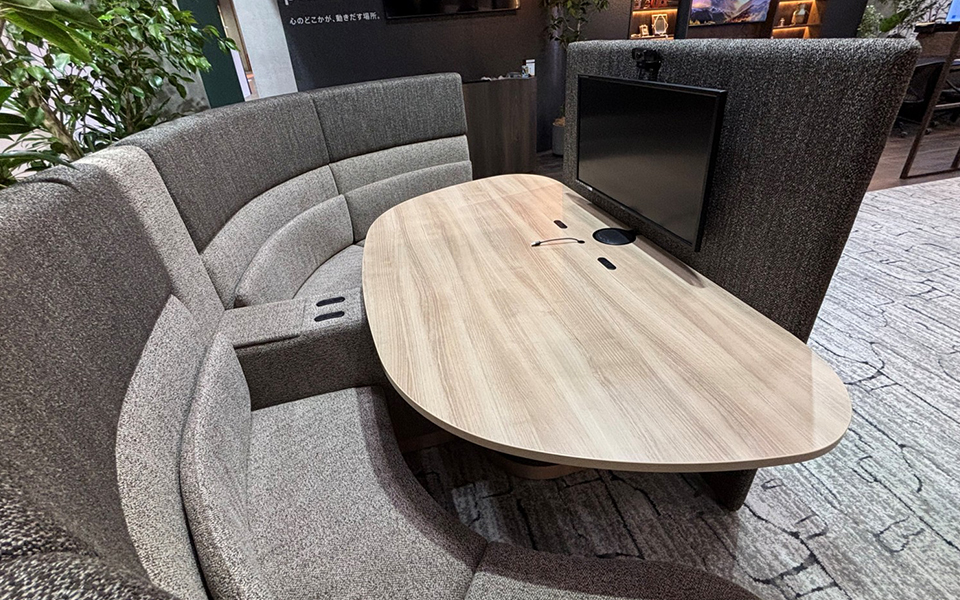 オープンな空間でありながら、周囲の生産性を下げない画期的なミーティングセットです。モニターの音が周囲に漏れない驚きの仕組みをご体感いただきました。