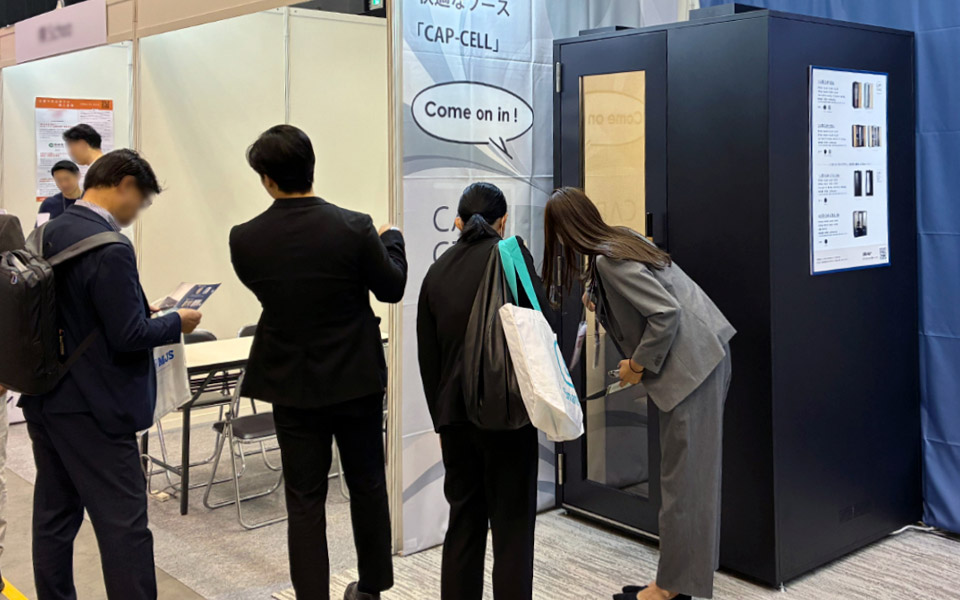 インテリア性・遮音性に優れた個室ブース “CAP-CELL Lite”。エアコン付きソファを搭載可能で、空気がこもりがちな個室ブースでも快適にお過ごしいただける空間をご体感いただきました。