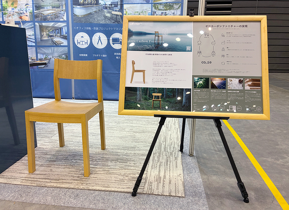 “ゼロカーボンファニチャー” は、材料調達・製造・流通・リサイクルのプロセスを通じて「CO2総排出量 実質ゼロ」を実現する家具です。環境負荷低減だけでなく、座り心地や見た目の美しさにもこだわった “ゼロカーボンチェア” を展示いたしました。